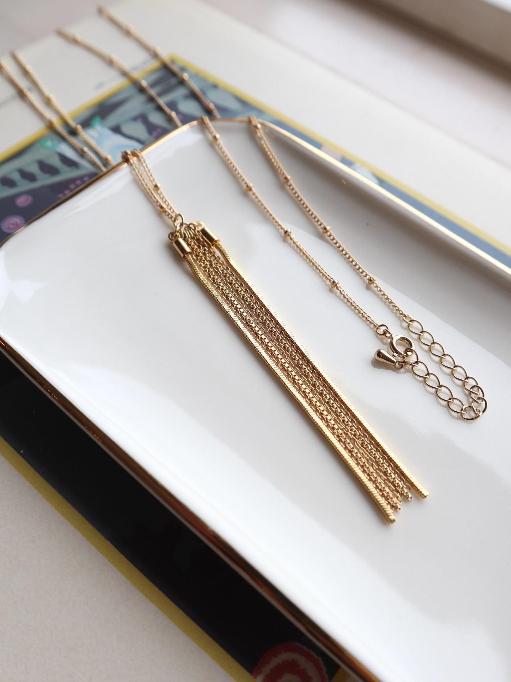 素材:ステンレス(SUS304)にニッケルフリーメッキ(ネックレスチェーン)、合金にGP(タッセル・留め具&アジャスター)